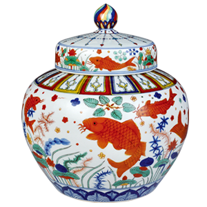 仿明嘉靖五彩魚(yú)藻紋蓋罐